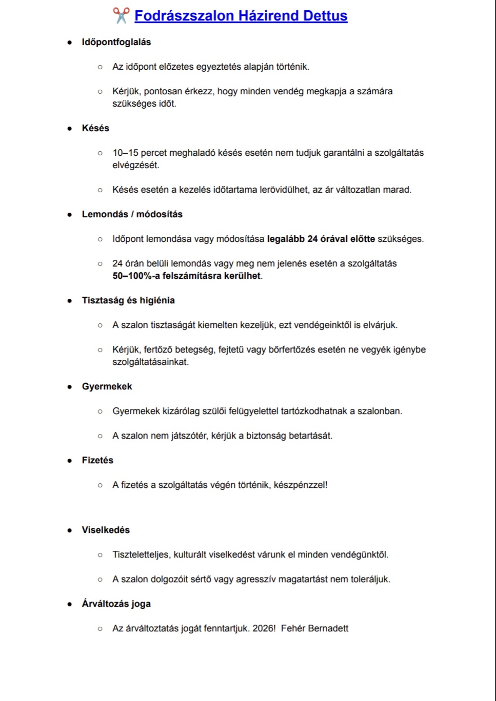 Fontosnak tartom az elolvasását, egyre gyakoribb a szépségipar és egyéb szolgáltatók körében, hogy sokan nem tisztelik az időnk, munkánk, illetve mennyi kiadással is jár egy vállalkozás. A sok vendég aki nem jelenik meg az időpontjára nem szól, nem tiszteli sem az időm, sem a munkám. Ezt a pénzkiesést semmivel nem tudjuk utólagosan pótolni, így kérlek olvasd el a házirendet, érkezz meg időben és engedd magad szépülni! :)